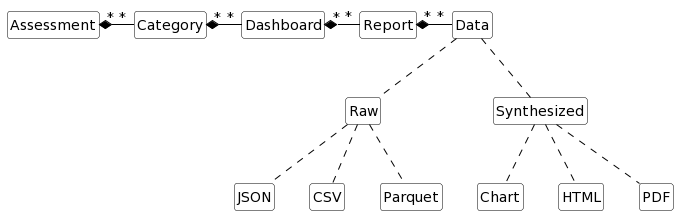 Report is the atomic unit of work that can either return data or a visual object. The data can be specified in multiple formats. A Dashboard is a collection of one or more reports. Each Dashboard is categorized under Category (needless repetition!!) and the categories are nested inside Assessment. The Dashboards and the Reports can be for a specific Assessment Run or across multiple Assessment Runs or even can span over multiple Assessments.