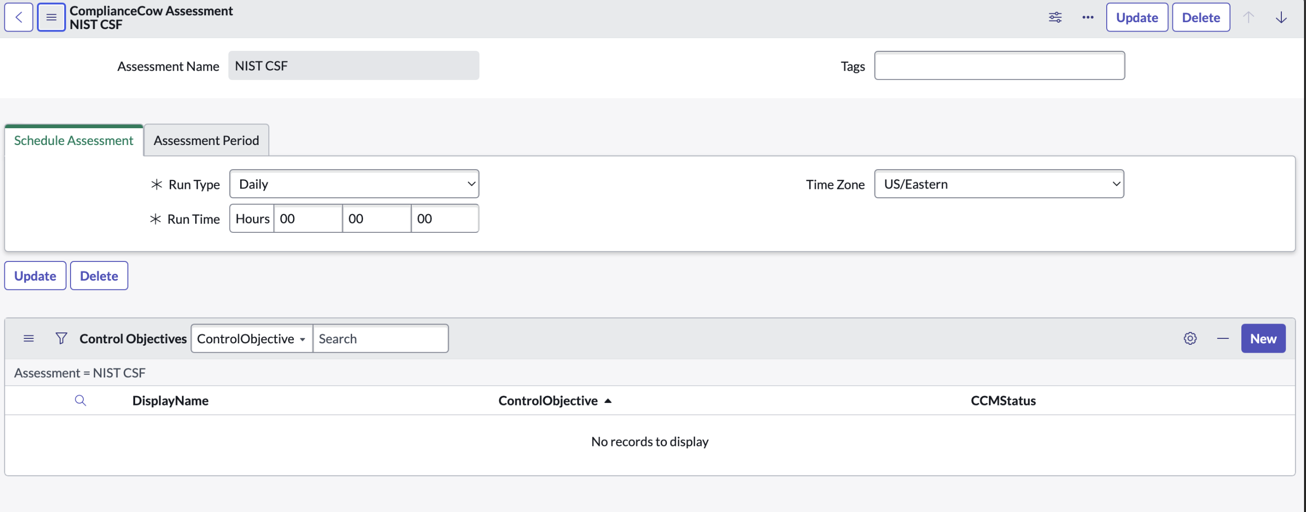 6.1 Once the assessment is added, a related tab – Control Objective would appear at the bottom of the form. Click on the New button in this tab to open the Control Mapping-ComplianceCowAssessment screen