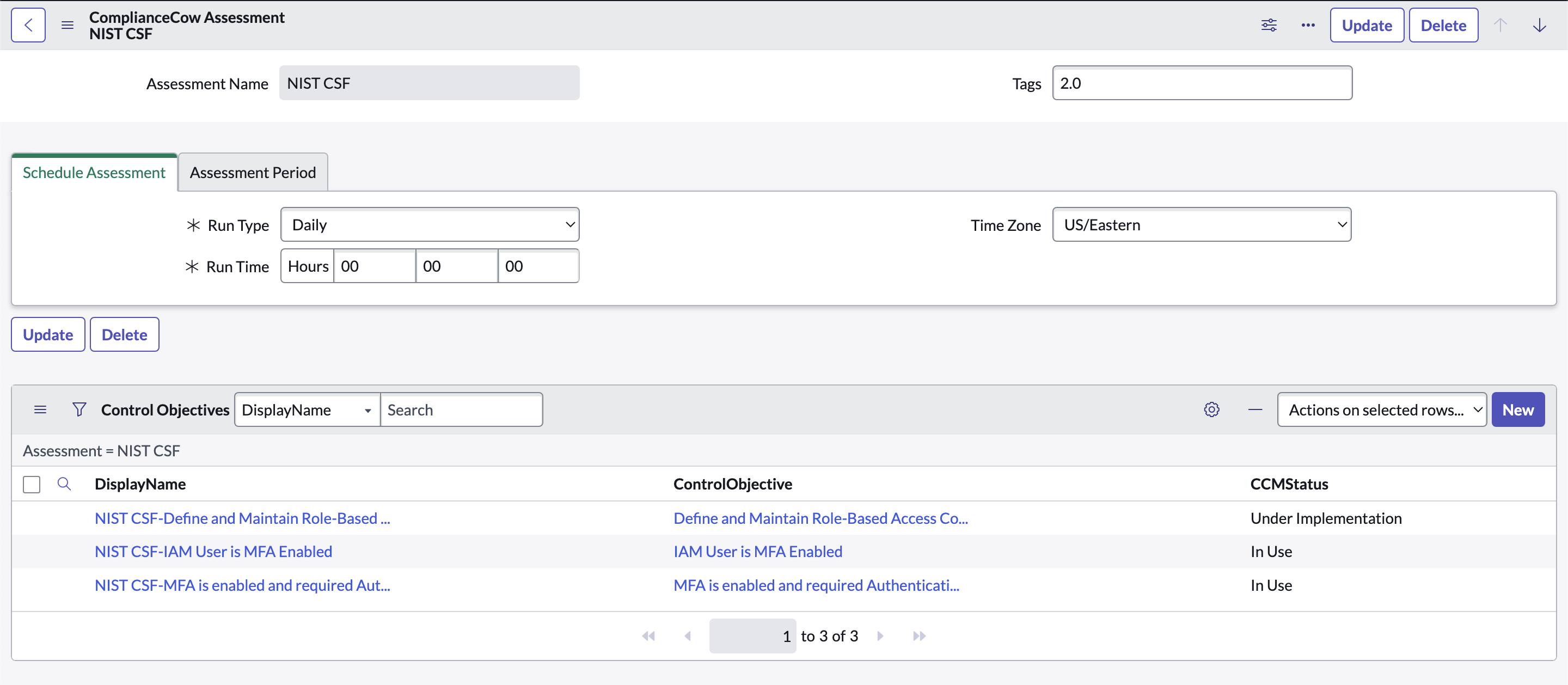 The control objectives are set up in the ComplianceCow Instance. A dedicated Instance is set up to perform these assessments by ComplianceCow. When the control objectives are ready for the assessment, an API call from ComplianceCow is sent to ServiceNow to activate the CCM Status. The CCM Status is changed to In-Use