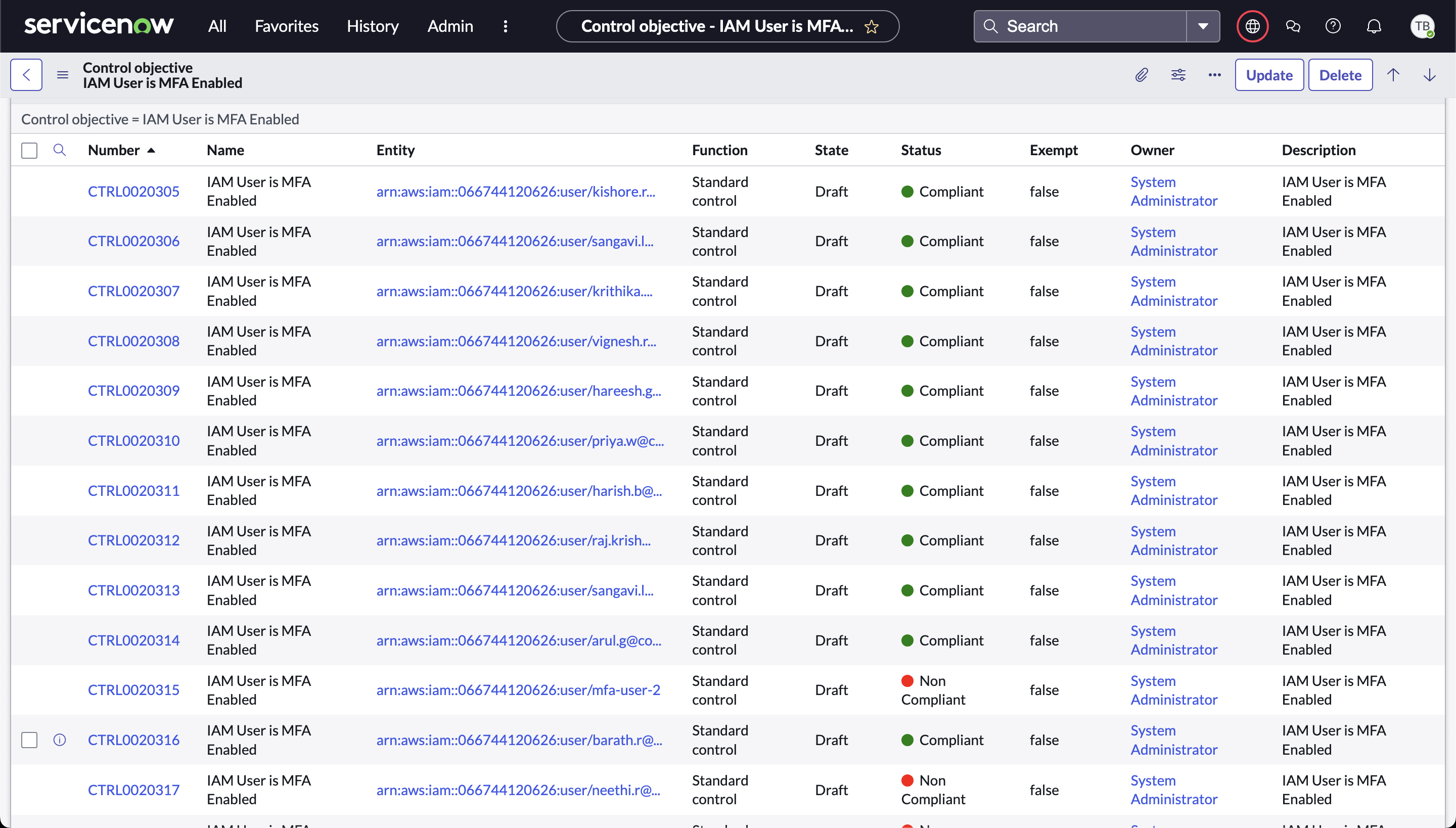 After the GRC indicator nightly scheduled job is run, compliance status is pronounced for the controls. To check the compliance status, click on the control objective in the Control objective Column.