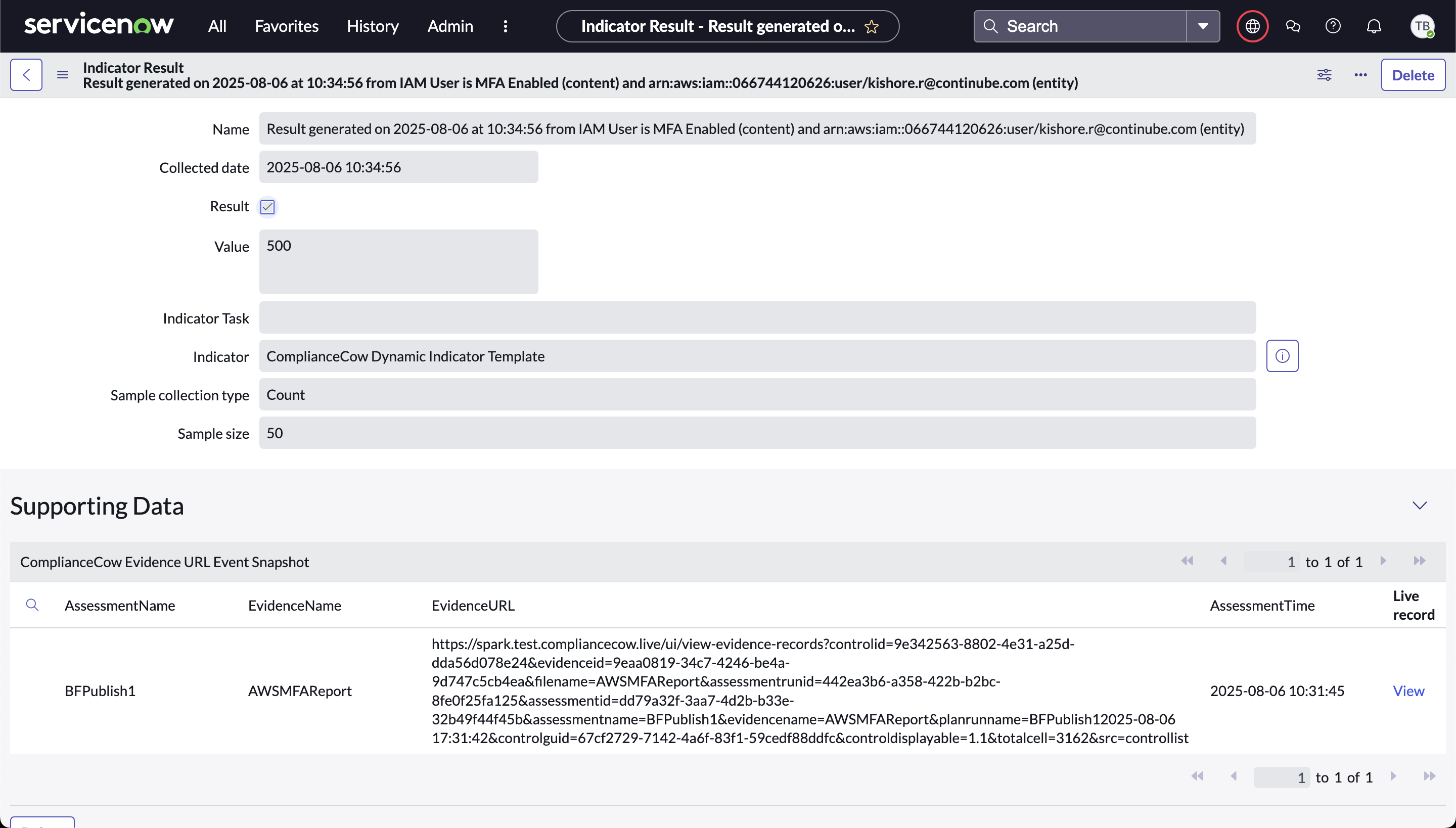 8.5 Clicking on the Evidence URL takes the user to the ComplianceCow Instance. Here additional details regarding the assessment result can be obtained.